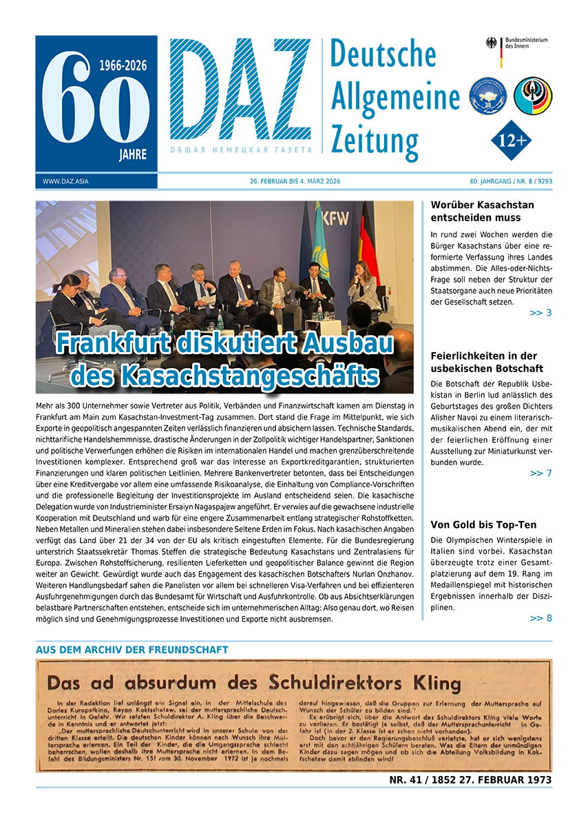 Dazu zeigte sich auch Frau Richter diskussionsbereit und wies auf den Zeitunterschied zwischen Kasachstan und Deutschland hin, welcher ihr und den anderen Mitarbeitern in der Botschaft viel geistige Mobilität abverlangt. In der Winterzeit trennen Kasachstan und Deutschland fünf Stunden.
