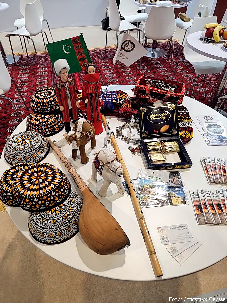 Eine Besonderheit auf der Internationalen Tourismusbörse ist Turkmenistan, welches mit einem eher kleineren Stand vertreten war. Der zentralasiatische Staat ist eines der am wenigsten besuchten Länder der Welt. Etwa 80% des Landes sind von der Karakum-Wüste (vom „Schwarzer Sand“) bedeckt, einer der trockensten Wüsten der Welt.