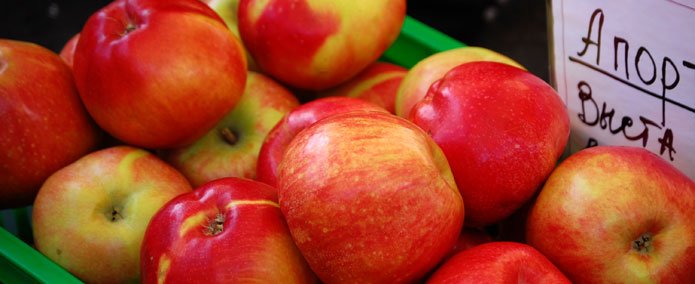 Die berühmten Aport-Äpfel. Unten: großer Andrang beim Apfelfest in Almaty.