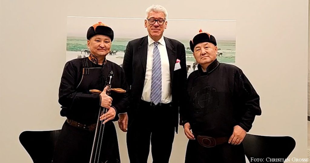 Eröffnet wurde der festliche Abend mit einer instrumentellen und gesanglichen Darbietung mongolischer Volksmusik von der Gruppe „Blue Mongolia“ mit der „Ode an „Chinggis Khaan“. Die Texte und Lieder werden seit Generationen weitergegeben. Die mongolische Gesangskunst Khoomei oder Hooliin Chor ist ein spezieller Gesangstil, der sogenannte Kehlengesang, bei dem ein einzelner Interpret eine vielfältige Harmonie aus mehreren Stimmlagen erzeugt, einschließlich eines kontinuierlichen Basselements, das im Kehlkopf erzeugt wird.