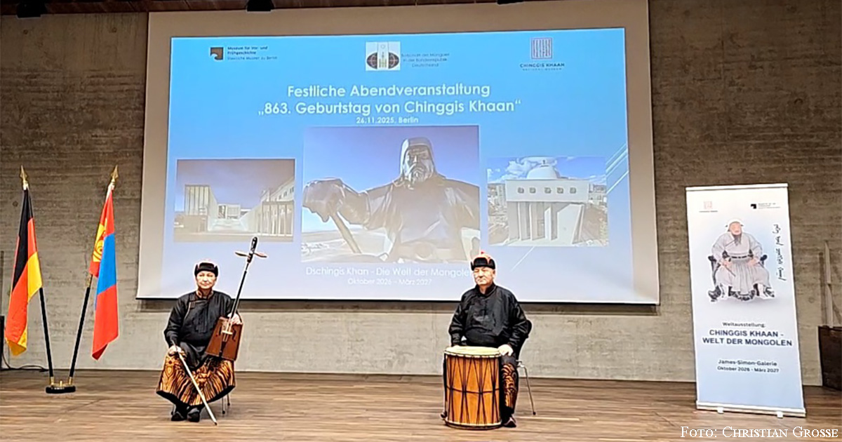 Zu einer festlichen Abendveranstaltung lud der Botschafter der Mongolei, S.E. Dr. Mandakhbilig Birvaa und Prof. Dr. Matthias Wemhoff, Direktor des Museums für Vor- und Frühgeschichte, Staatliche Museen zu Berlin, Gäste aus Diplomatie, Wirtschaft, Politik, Kunst, Kultur und Zivilgesellschaft in die renommierte „James – Simon- Gallerie“, die sich auf der berühmten UNESCO Weltkulturerbe Museumsinsel in Berlin-Mitte befindet, zu einem Festakt ein. Dieser bestand aus mehreren Passagen.