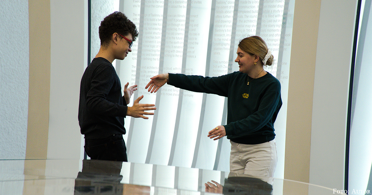 Ein kurzer Abstecher zur Garderobe, ehe die Körper-Performance losgeht. Das Treppenhaus glänzt in kühlem Silberglas. Es würde nicht wundern, wenn unten die Ausgabe der Raumanzüge stattfände, mit denen es dann ab ins All ginge. Wieder oben angekommen, hat sich schon eine kleine Traube an Wartenden im Foyer breit gemacht. Das Publikum ist, wie fast schon selbstverständlich, dreisprachig: Kasachisch, Russisch und Englisch. Die Gesprächsthemen sind, auch das ist wenig überraschend, akademisch geprägt. Vielleicht aber auch schon eine Mini-Performance des „freien Geistes“, was ja passend wäre, hier in der kasachischen Herzkammer der kreativen Grenzenlosigkeit.