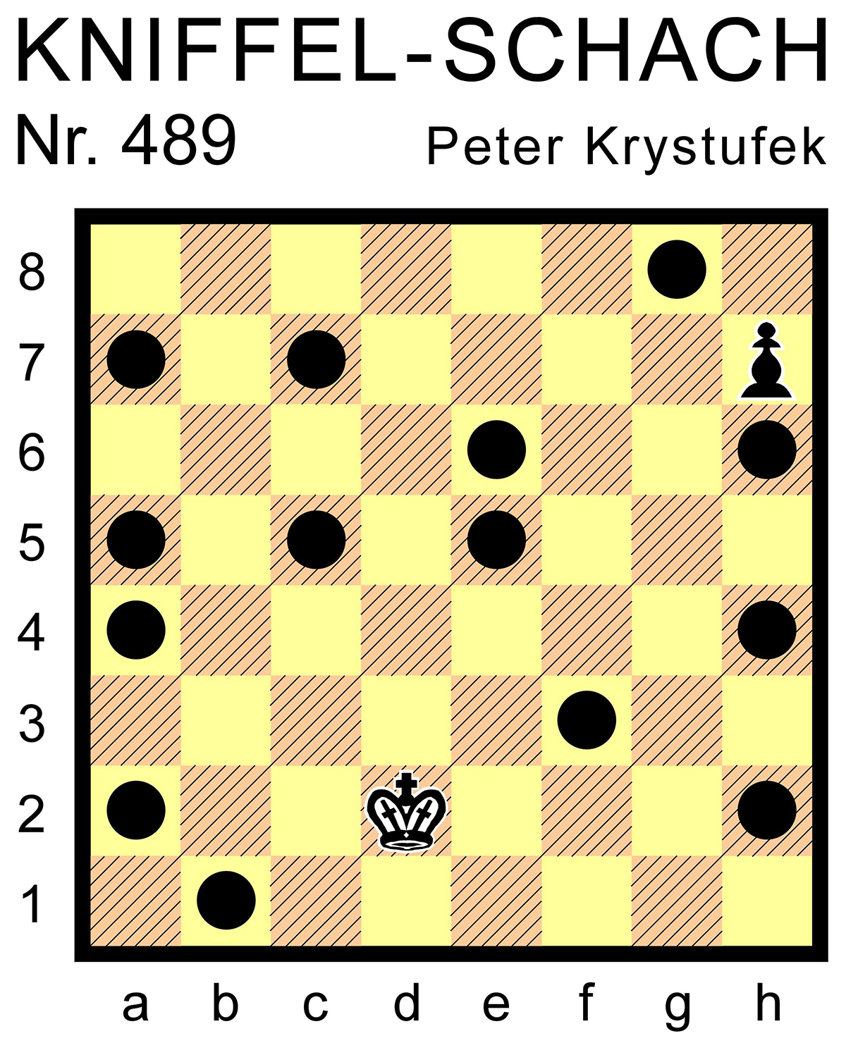 Auf den markierten Feldern stehen originale schwarze Schachfiguren so, dass keine irgendeine andere deckt (betrifft auch den schwarzen König). – Auf welches freie Feld muss noch der wK eingesetzt werden, damit Schwarz am Zug einzügig patt setzen kann?