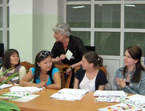 Schülersommerkurs in Astana – die Ausstellung der „Buddy Bears“ regt zu unterschiedlichen Projekten an.