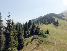 Saftige grüne Bergwiesen auf dem Kok-Zhaljau begeistern die Wanderer.