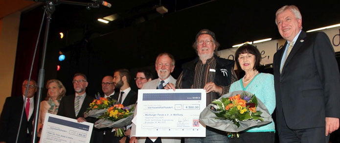 StartVolker Bouffier vergibt LandespreisDer hessische Ministerpräsident Volker Bouffier (r.) ehrte die Preisträger vom Weilburger Forum und von der Adam-von-Trott-Schule.