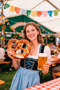 Октоберфест не только пивной праздник, но и своего рода ярмарка невест. Есть мнение, что в Баварии женщины намного красивее, чем в Германии в целом. И этому есть своё объяснение – дирндль. Это одеяние – один из символов Октоберфеста. Название происходит от регионального слова Dirndlkleid. В переводе с баварского диалекта – платье девушки-служанки. Наряд характерен исключительно для альпийского юга Германии – Баварии. Чудные романтичные платья с фартуками пленяют каждого. Особенно с пышным декольте.