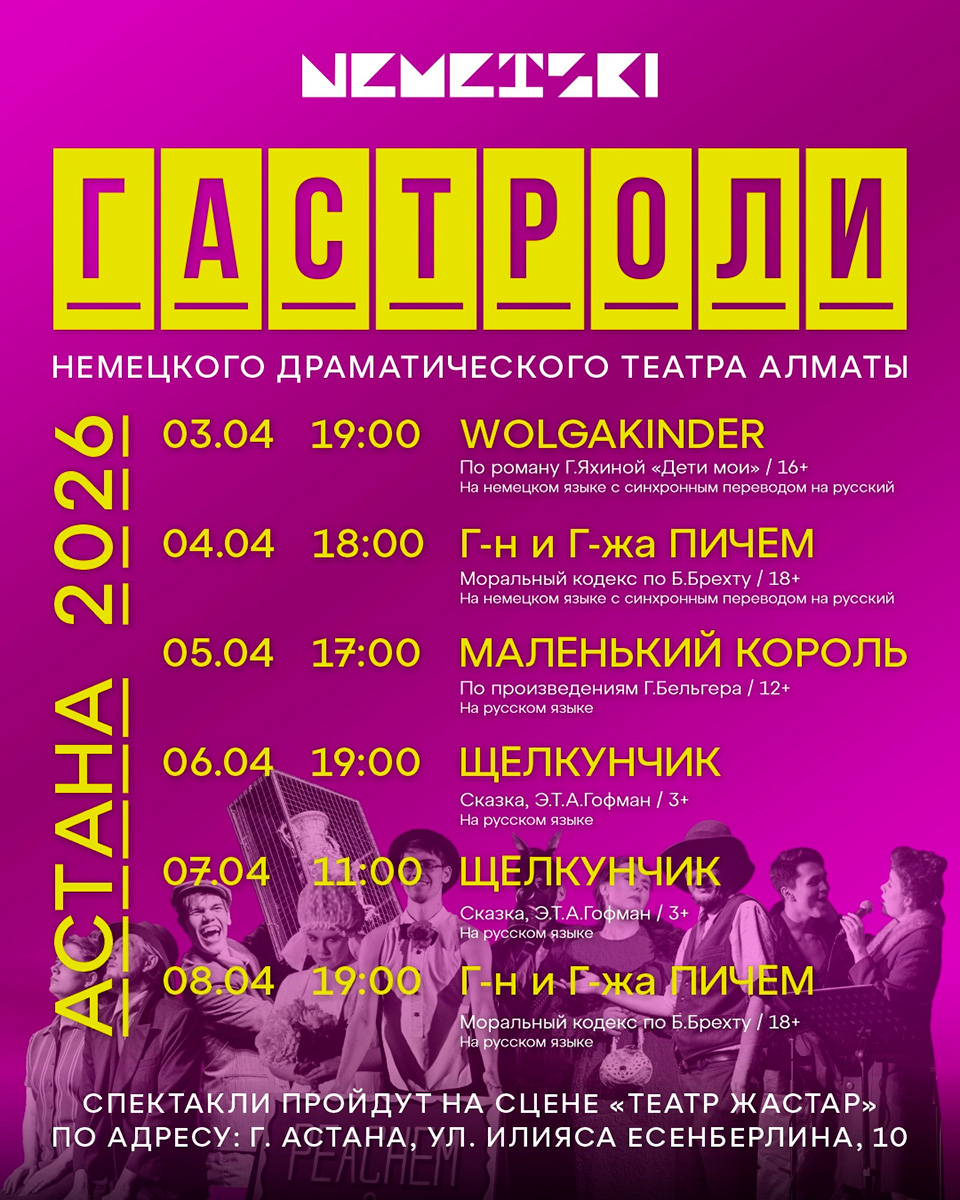 С 1 по 8 апреля на сцене столичного театра «Жастар» (ул. И. Есенберлина, 10) пройдут гастроли Республиканского академического немецкого драматического театра. Спектакли НЕМЕЦКОГО – для тех, кто ценит интеллектуальное искусство и европейский стиль.