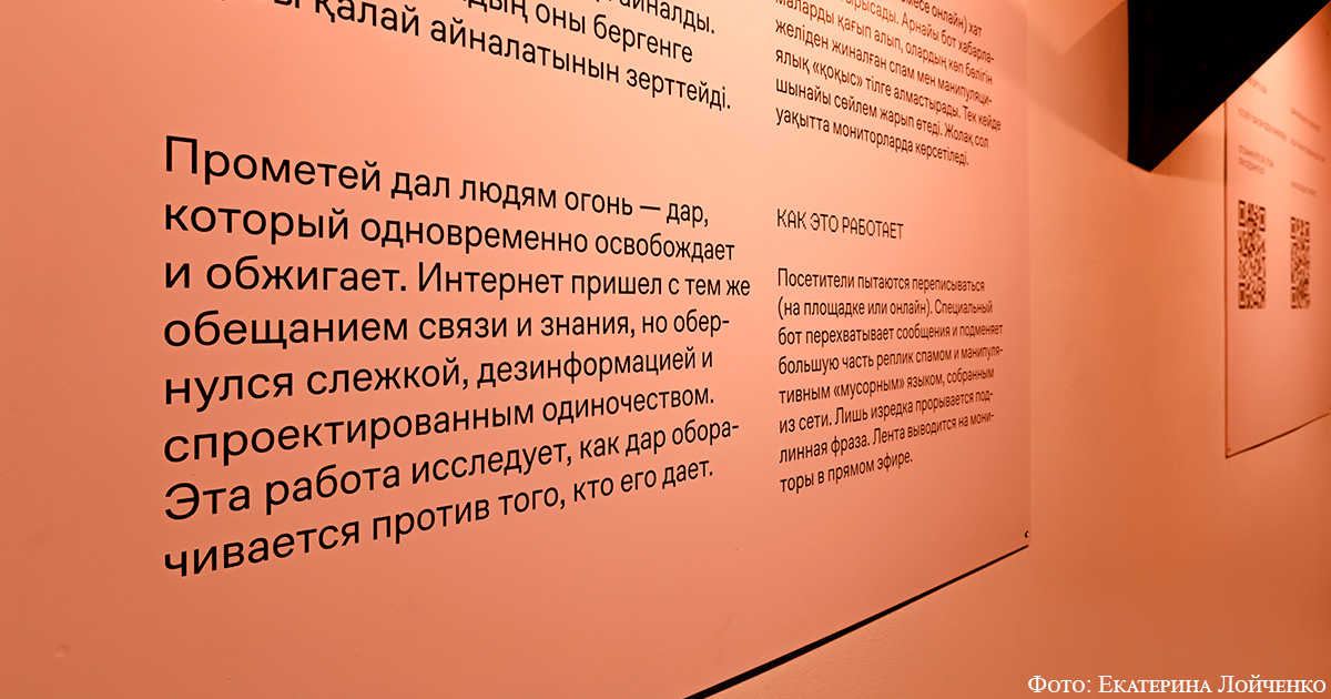 В центре инсталляции – чат-бот, куда встроены кликбейтные формулировки, тревожный спам, обрывки заголовков, искажённые диалоги из интернета и фрагменты тревожных новостных лент. Зрители пытаются общаться друг с другом, но между ними действует невидимый посредник, подменяет их фразы и разрушает смысл. Так рождается пространство, где человек пытается сказать правду, но система создаёт шум, в котором сложно различить настоящее.