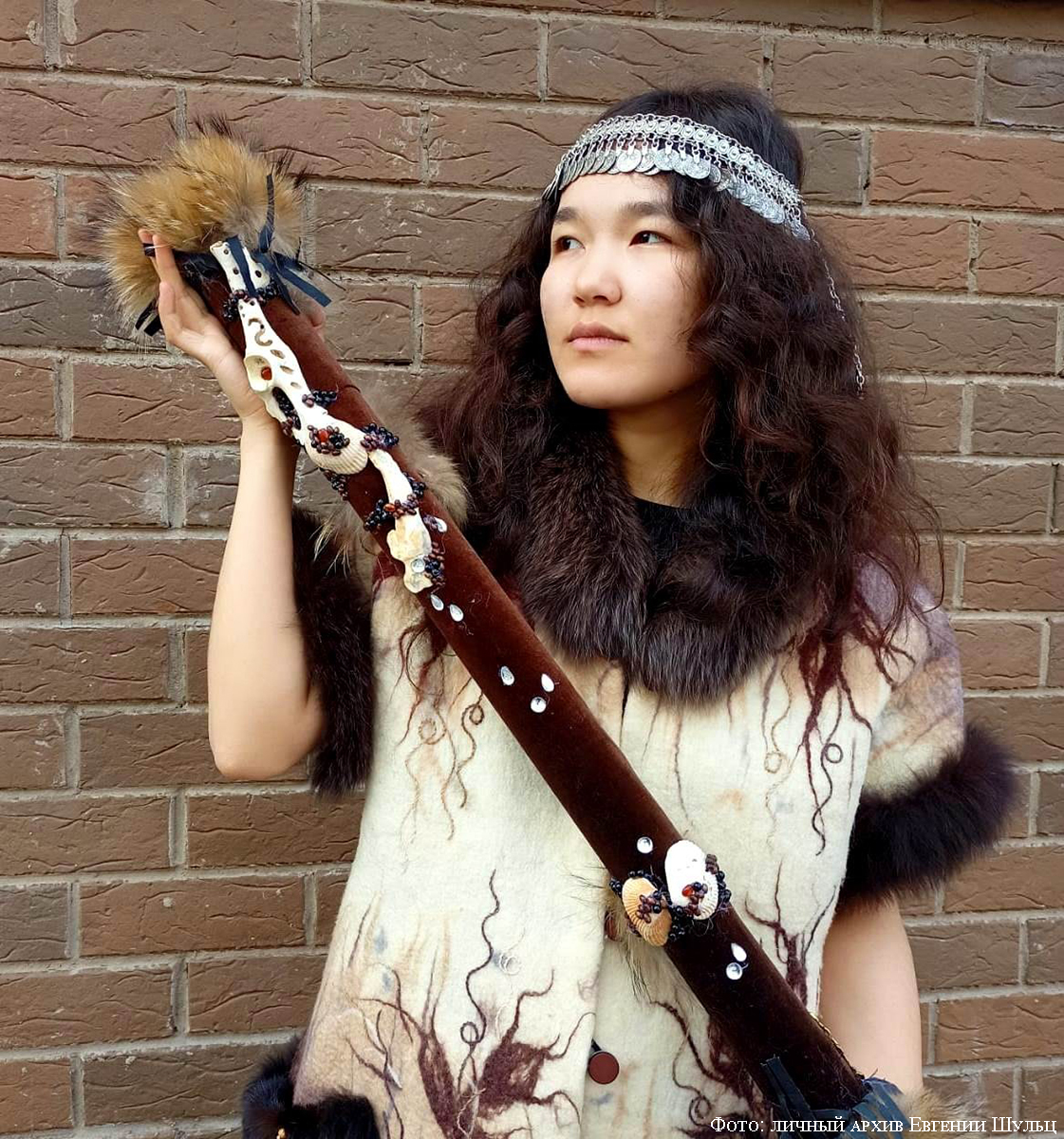 Пока Надежда пришивала трехметровые крылья богине Умай, я показывала участникам фестиваля музыкальный инструмент «Шум дождя». Уникальная вещь, появившаяся в глубокой древности, известна среди этнических музыкантов мира как «рейнстик». Украшенный мехом, натуральными камнями и костью инструмент обладает умиротворяющим медиативным действием. Наклоняя его поочередно в разные стороны, можно услышать как осенний дождь шепчет о странностях судьбы, вечной любви и тихом забвении…