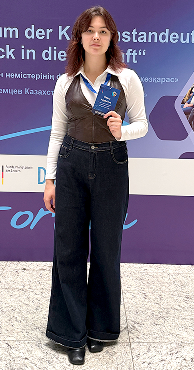Студентка KIMEP – Иностранные языки, переводческое дело, детская и семейная психология, руковожу департаментом актеров. Свободно владею русским, немецким, английским, казахским. Читаю и понимаю латынь. Китайский А2. Обладатель награды «Самый активный участник КНМ «Vorwärts» — 2024». Играю на домбре, калимбе и барабанах. Много читаю. Являюсь лидером клуба немецкой молодежи Алматы. Руковожу кружком Landeskunde, веду аккаунты КНМ в социальных сетях, влог из жизни молодежного лидера и этнокультурного работника. В 2025 году запускала челлендж «50 книг за год». Проводила тренинги по ораторскому искусству, организовывала мероприятия на «Mach Mit».