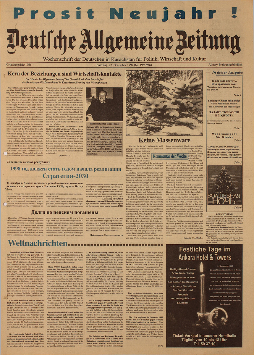 Дома я тут же достал и развернул то, что предназначалось именно мне. Моему удивлению и радости не было предела. Передо мной лежала настоящая немецкая газета. Чёрно-белая бумага с характерным запахом типографской краски, три магические буквы DAZ и надпись Deutsche Allgemeine Zeitung в заголовке навсегда оставили в моей памяти неизгладимый след.