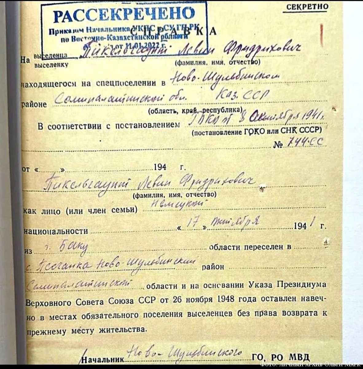 Бабушку Ольги и её отца оставили в Баку под надзором комендатуры. Главой семьи являлся дед – русский по национальности.
